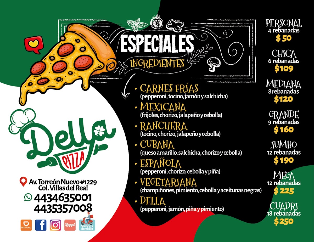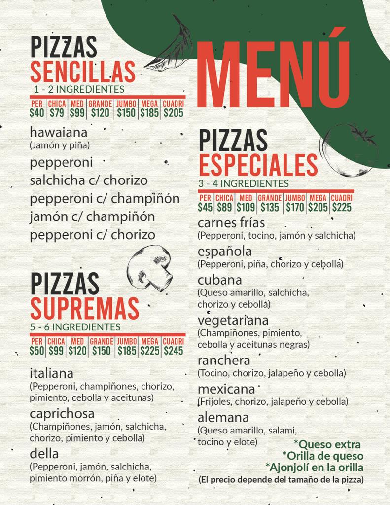 Welcome to DELLA PIZZA, a gem located at Av. Torreon Nuevo 1229 in Morelia. This pizzeria prides itself on a menu rich with mouthwatering options. You’ll find classic favorites like the Hawaiian Pizza, topped with savory ham and fresh pineapple, and the robust Pepperoni Pizza, a staple that never disappoints. Each pizza is crafted with 100% fresh ingredients, ensuring quality from the first bite to the last.